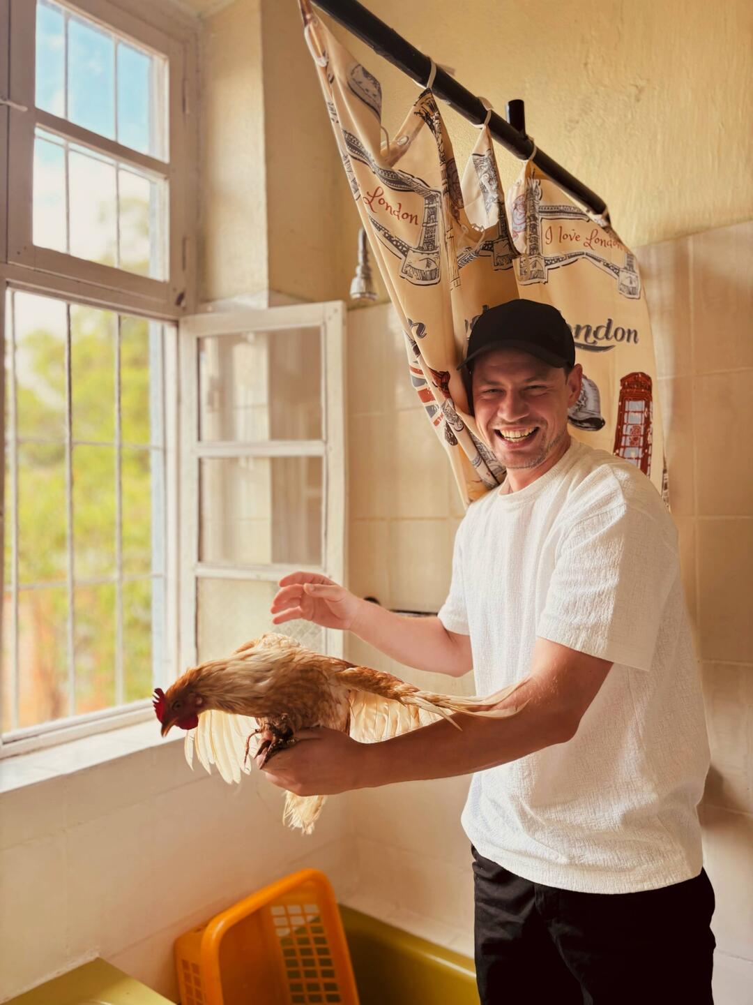 Also mache ich mich auf den Weg mit dem Hahn unterm Arm. Die Mädels wollen nicht dabei sein, nur Anna erklärt sich bereit und filmt ein wenig. Serafina und ihre Kollegin Maria empfangen uns in der Küche. Die Holzöfen sind bereits an, und der Gockel wird sehnsüchtig erwartet. Wir warten noch ein wenig, bis das Wasser über der Flamme kocht. Anna und ich überlegen, ob wir den Hahn jetzt einfach ins kochende Wasser werfen sollen. Doch das erscheint uns nicht ganz richtig. Als das Wasser dann endlich kocht, gibt es erstmal Entwarnung: Wir sollen Maria folgen. Sie nimmt ein Messer und führt uns hinter die Küche, ins Freie. Sie gibt mir das Messer, legt den Hahn auf die Seite und fixiert mit einem Fuß seine Beine und mit dem anderen seine Flügel. Dann hält sie den Kopf des Hahns und zieht die Federn am Hals. Der Hahn scheint erstaunlich ruhig zu sein – oder vielleicht auch geschockt. Jedenfalls macht er keinen Mucks und bewegt sich nicht. Nur seine Augen blinzeln ab und zu.