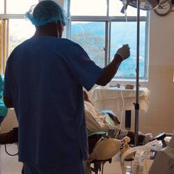 Bei den hochschwangeren Frauen, die die Entbindung erwarten, bin ich mit dem Doppler-Gerät unterwegs. Ich leite die Herztöne der Föten ab und überprüfe die Pulsrate. Es ist faszinierend, wie viel man allein durch die Palpation (das Tasten) über die Lage des Ungeborenen erfahren kann. Ich nehme den Bauch der Schwangeren zwischen meine Hände und übe leicht Druck aus. Mit den Fingerspitzen kann man dann den Rücken ertasten. Auf der gegenüberliegenden Seite liegen Kopf, Füße und Hände des Babys. Es ist schwer zu erklären, aber man kann es sich vielleicht vorstellen. Den Doppler setze ich auf der Seite an, auf der ich den Rücken ertaste. So ist die Wahrscheinlichkeit, das Herz mit den Ultraschallwellen zu treffen, am größten. Alle Werte sind heute Morgen im Normbereich, sodass wir in den Kreissaal gehen, der eher an eine Filmkulisse aus einem Horrorfilm erinnert. Für tansanische Verhältnisse ist er jedoch durchaus gemütlich, sagen die Nurses. Dr. Bosco begleitet mich. Er stellt mir Josepha vor, eine junge Frau Ende 20, die heute entbinden wird. Sie ist meine Patientin, und Dr. Bosco wird mich anleiten und unterstützen.