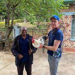 Gegen Mittag klingelt es an der Tür – zwei weitere Volunteers aus der Organisation, mit der auch Anna und Robin hier sind, kommen vorbei. Überraschung geglückt! Im Krankenhaus hat uns der Schreiner Kerzenständer aus zwei Holzblöcken gefräst, und so haben wir in den letzten Tagen sogar 20 Kerzen besorgt. Auch Kerzen sind hier unglaublich teuer, vor allem für tansanische Verhältnisse. Aber heute ist ein besonderer Tag: Robin wird 20! Nach Kuchen und Geschenken gibt es dann Mittagessen. Serafina bittet mich, den Hahn, den wir gestern bekommen haben, in die Krankenhausküche zu bringen. Meine Chance, dabei zu sein, wie unser Essen zubereitet wird.