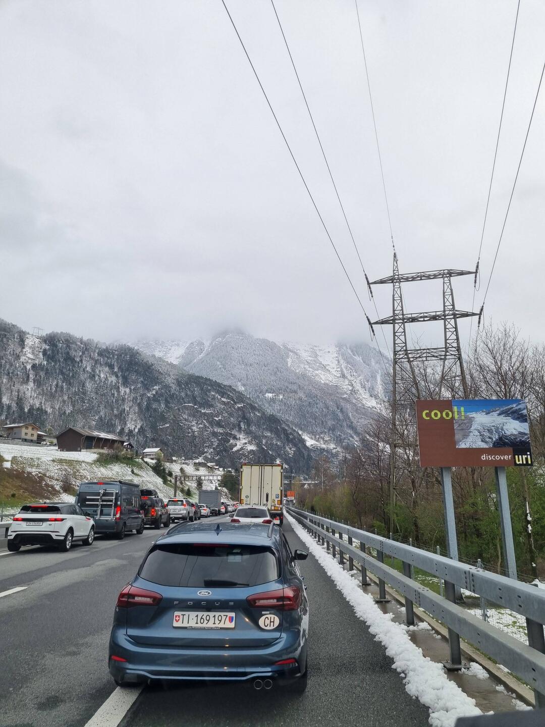 Bei 2 Grad und Schneefall hoch zum verschneiten Gotthard Tunnel hochgekämpft, wie immer Stau an den Ampel🏔😑