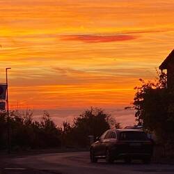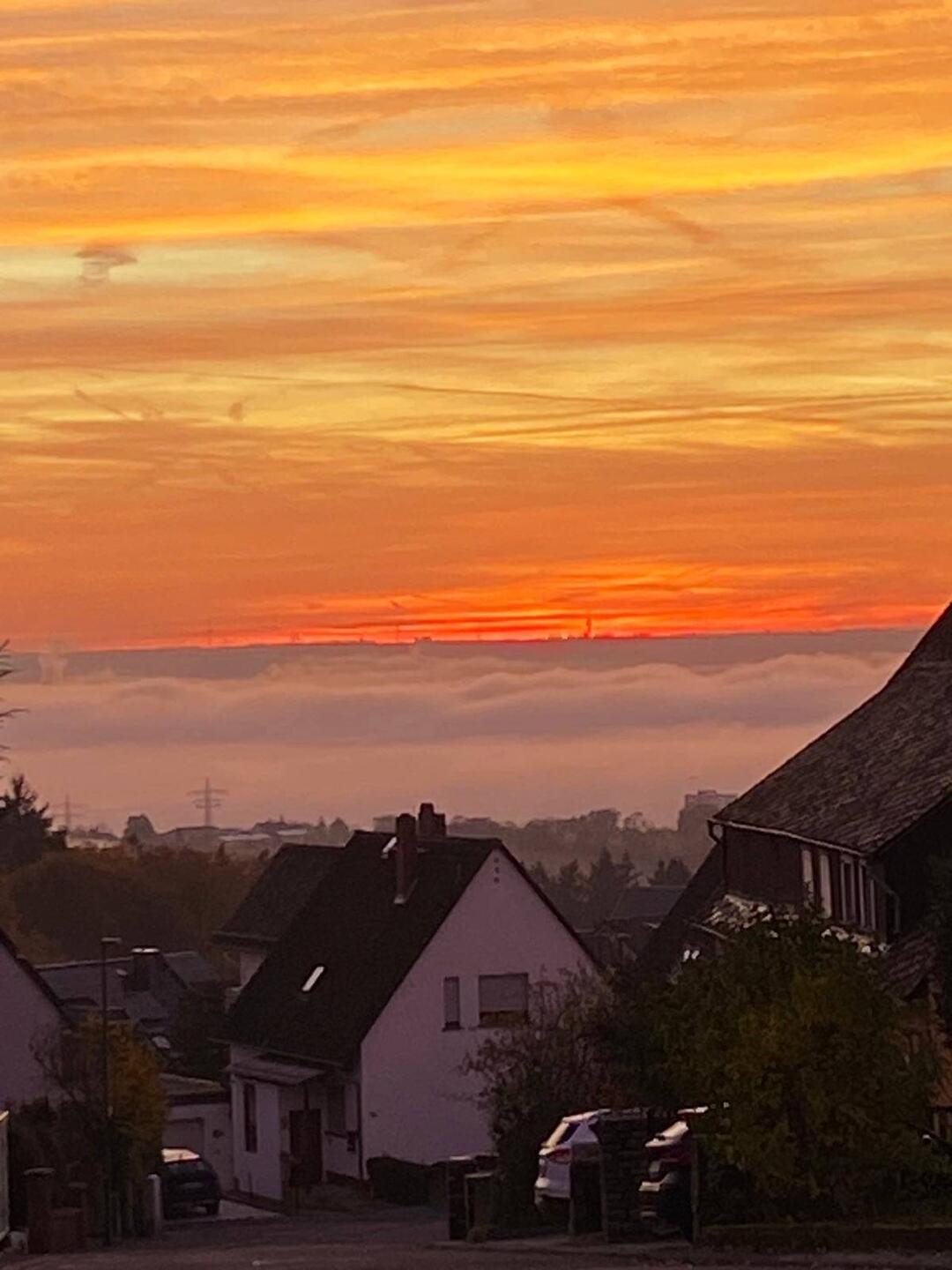 Auch das gehört zum Herbst: über dem Fluss liegt eine watteweiche Wolkendecke. Darüber entfacht die aufgehende Sonne ein Farbspektakel. Man kann nur stehen, schauen und staunen