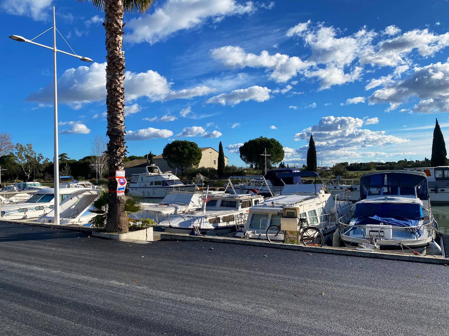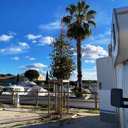 Hier stehen wir doch richtig: mit Blick auf dem Yachthafen und fast unter Palmen!