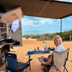 Und die Zeit verging wie im Flug, da war es auch schon 10 - ready to Check in. Ein Site direkt in der 1. Reihe - where else could you be? - hat der freundliche Nachbarcamper gefragt und da hat er natürlich recht, viel schöner geht es nicht mehr. Wir haben also unser Vordach aufgebaut und sind erstmal ins Meer. Noch nicht ganz drinnen haben wir einen Blick zurück auf unseren Camper geworfen und uns gewundert wieso da ein fremder Mann bei unseren Stühlen steht!?? Und dann habe ich die Emus gesehen😱😱 und bin zurück gelaufen. Die Biester, die ich auf der Herfahrt im Auto noch unbedingt sehen wollte, hatten sich über unsere Nudeln hergemacht. Eine geschlossene Packung natürlich roher Nudeln aus der Küche geholt, aufgepickt und als ich beim Auto war, lagen nur noch ein paar wenige am Boden vor der Küche verstreut 🤦♀️. Wir hatten unsere Liebe Not die Biester zu dritt zu vertreiben. Unglaublich, rohe Nudeln. Naja, als sie endlich weg waren und die Küche zu, konnten wir endlich ins Meer und an den Pool.