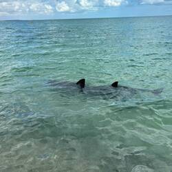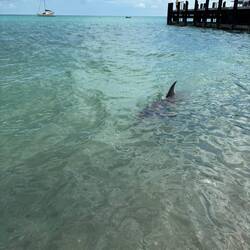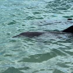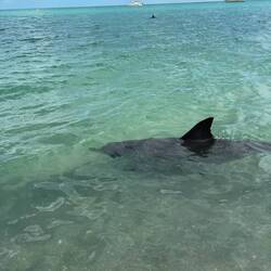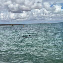Das nicht vorgestellt und sind deshalb gleich weiter nach Monkey Mia, das auf der Westseite der Halbinsel liegt. Schon nach einem kurzen Stück hat es aufgerissen und die Sonne strahlt bald wieder von einem nur leicht bewölkten Himmel. Allerdings blieb es windig. Um 8.45 Uhr waren wir da, eigentlich zu spät für die Delfine und viel zu früh um einzuchecken. Also sind wir erstmal durch den Supermarkt an den Strand geschlendert und haben uns in den Schatten gesetzt. Wenige Leute waren da, alle mit Blick aufs Meer. Und plötzlich kam Bewegung auf, zwei nette Mädels haben uns vor an den Strand gebeten, die Delfine kamen zurück. Unglaublich wie nah und ins flache Wasser die kamen. Und wir standen ja direkt im Wasser. Es war unglaublich.