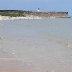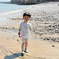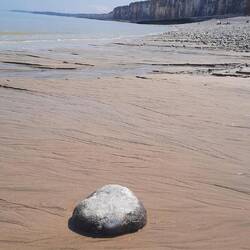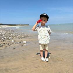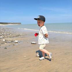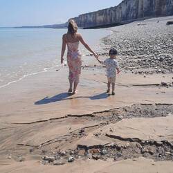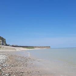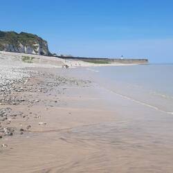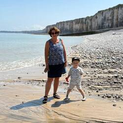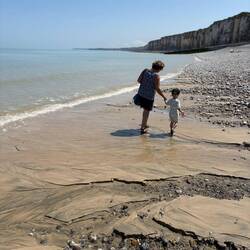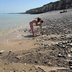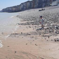 Vandaag de laatste dag dat Fleur en Logan er zijn. We willen nog even naar het strand. De baai vlakbij ons huis biedt geen voorzieningen dus rijden we naar Saint Valerie en Caux. We proberen nog een stukje eb (dat nu vroeg in de ochtend is) mee te pakken want dan is er hier en daar wat zand i.p.v. alleen kiezels... en dat is gelukt!