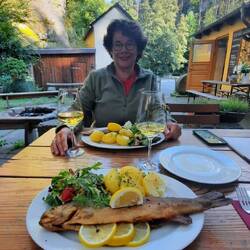 Halverwege is er een oude watermolen met een leuke berghut. Hier stoppen we om wat te drinken, maar er staat ook forel op de kaart. Mochten we dat nou nog graag willen eten, dus dat kunnen we nietEn savoir plus