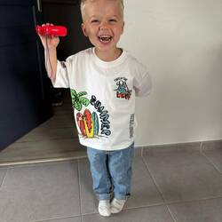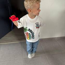 Na een korte regenbui gaat de zon weer schijnen. Het is meteen erg warm. We spelen nog ff lekker buiten met de bal en op de trampoline terwijl Fleur nog wat werkzaamheden doet.