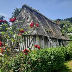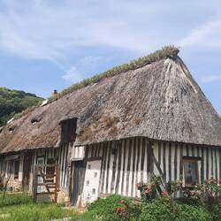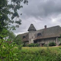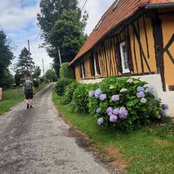 Het is een bijzonder gebied met veel rietgedekte Normandische boerderijen opgebouwd uit leem met stro en hout. Het lijkt net of we door een openluchtmuseum wandelen.