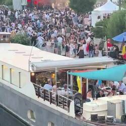 This is a striking nighttime capture of the Château du Prieuré, also known as the Donjon de Conflans, dramatically illuminated above the rooftops of Conflans-Sainte-Honorine, a town northwest of Paris at the confluence of the Seine and Oise rivers. Notable elements: • The Donjon, or keep, dates from the 11th or 12th century and is part of the remnants of a medieval fortress that once dominated the area. • The scene in the foreground suggests a bustling festival or concert on the waterfront—bright lights, tents, and a large crowd gathered along the quay. • The purple lighting and streamers give the event a festive atmosphere, while the orange floodlights on the Donjon contrast beautifully against the dark sky. Conflans is known as the capital of French inland waterway navigation, and events here often celebrate its maritime heritage. If this was around mid-June, it could be part of Fête de la Musique or a similar summer festival.