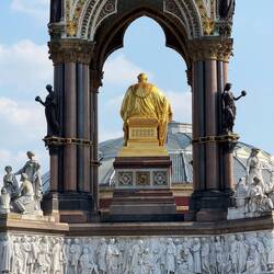 TravelerWhat a fantastic close-up! You’re looking at the back of the Prince Albert statue in the Albert Memorial, and in the background is the dome of the Royal Albert Hall — perfectly aligned as it was intentionally designed to be. Notable Details in This View: • The statue of Prince Albert is gilded in gold leaf, and even from the back, you can see the fine detail in the drapery and the inscription panels. • The white frieze running around the base features over 160 sculpted figures of prominent artists, poets, architects, and musicians — this side likely includes writers and musicians. • The black statues surrounding the canopy represent virtues and sciences, while above the arch are mosaics symbolizing the arts and sciences that Prince Albert championed. It’s one of the most elaborately symbolic Victorian memorials in existence. Did you get a look at the front of the statue as well, where Albert holds the catalogue of the Great Exhibition of 1851?
