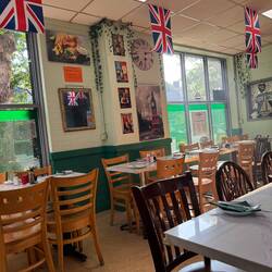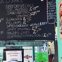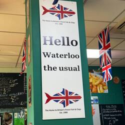 In for dinner at a Fish and Chips place. Couldn't leave England without some mushy peas and fish and chips!!