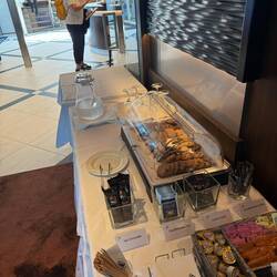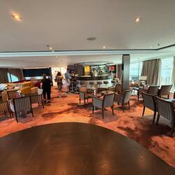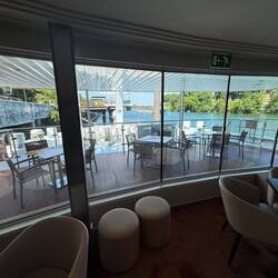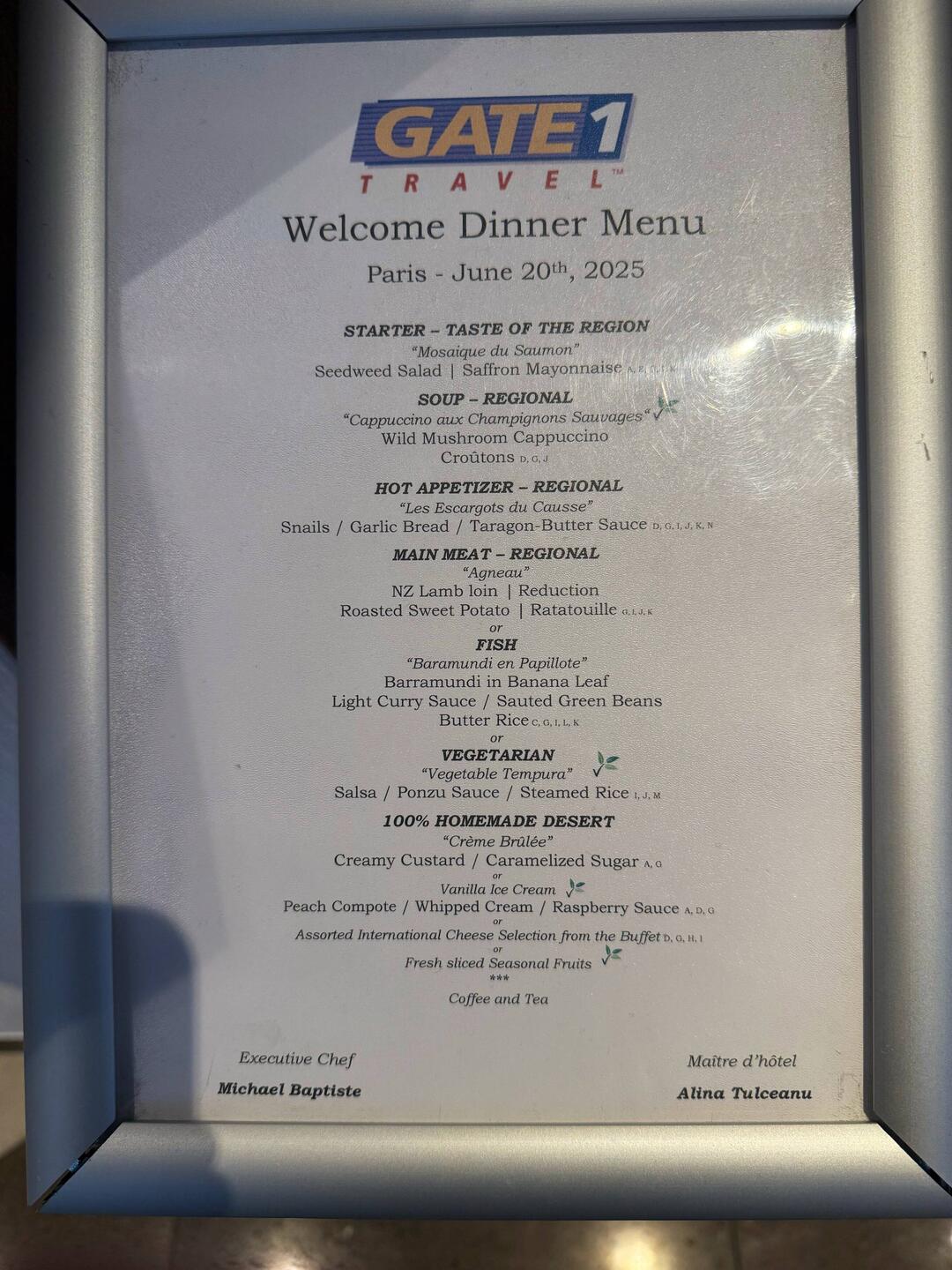 Welcome get together at 6. Safety procedures etc. a bit of champagne and some little tasties Entertainment director from Tunisia. He promises to be a hoot. A lot of the crew is from Romania. Executive Chef is from the UK. KATE, our cruise director went around and had everyone introduce themselves and say where they were from and how many Gate1 trips they've been on. One lady had been on 43 Gate1 trips.