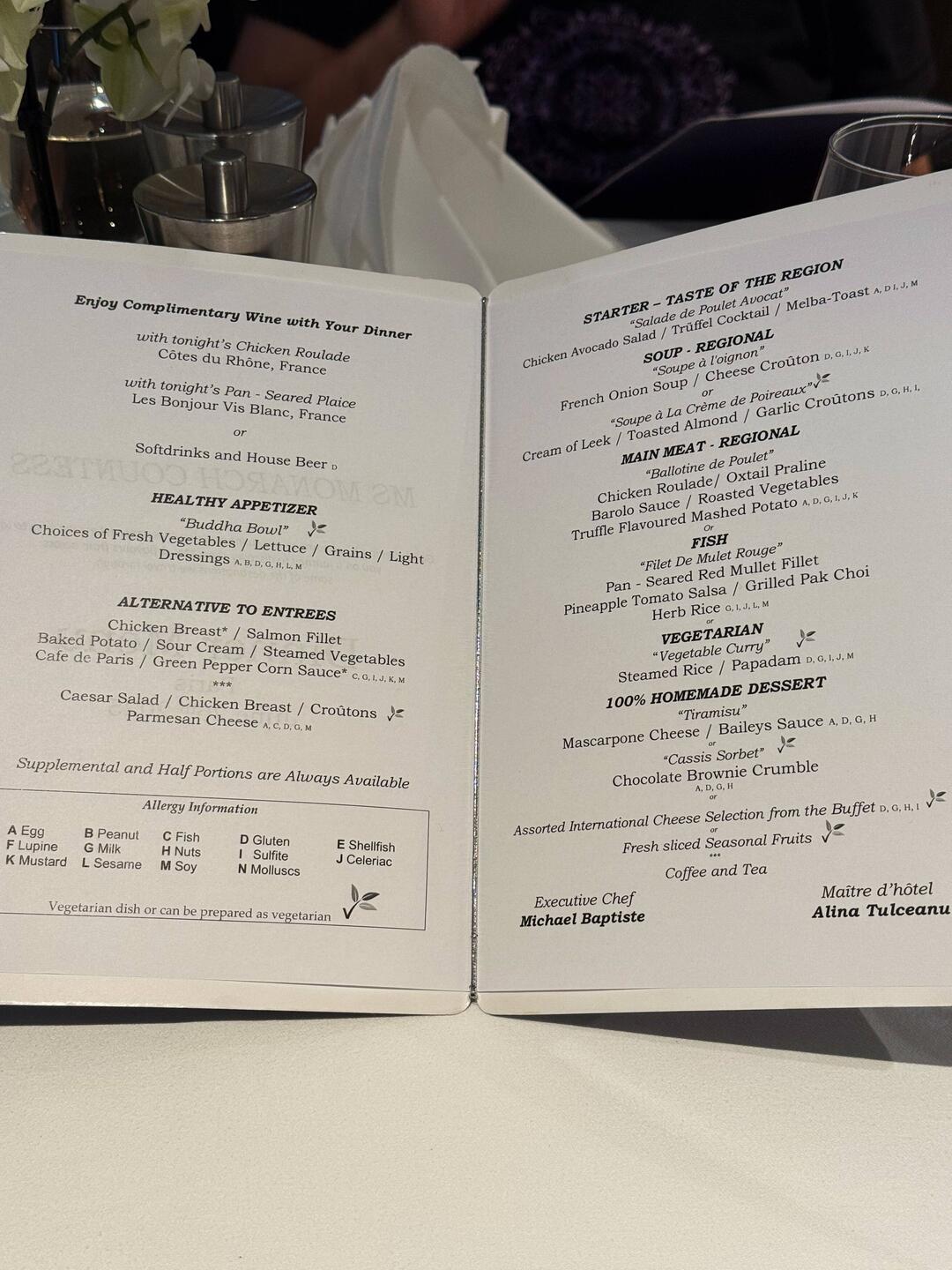 Great last dinner as usual. Will miss our new friends and our two servers, both of whom were from Bulgaria. He has been doing this for 17 yrs. 4 weeks on, 2 weeks off
