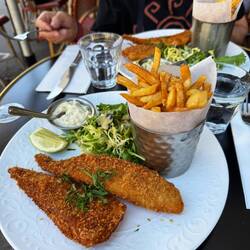 So we walked a block from the hotel and found a restaurant by the same name. How crazy is that? Sitting outside with a nice breeze. Ordered some fish and chips (sea bream).