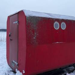 Er steht auf Kufen und wird vom Schneemobil aufs Eis gezogen. In der Mitte des Bodens befindet sich ein Loch, welches die Angler zum Eisangeln nutzen und dennoch ein Dach über dem Kopf haben. Meist wird ein portabler Ofen eingesetzt, damit es die Fischer auch warm haben.