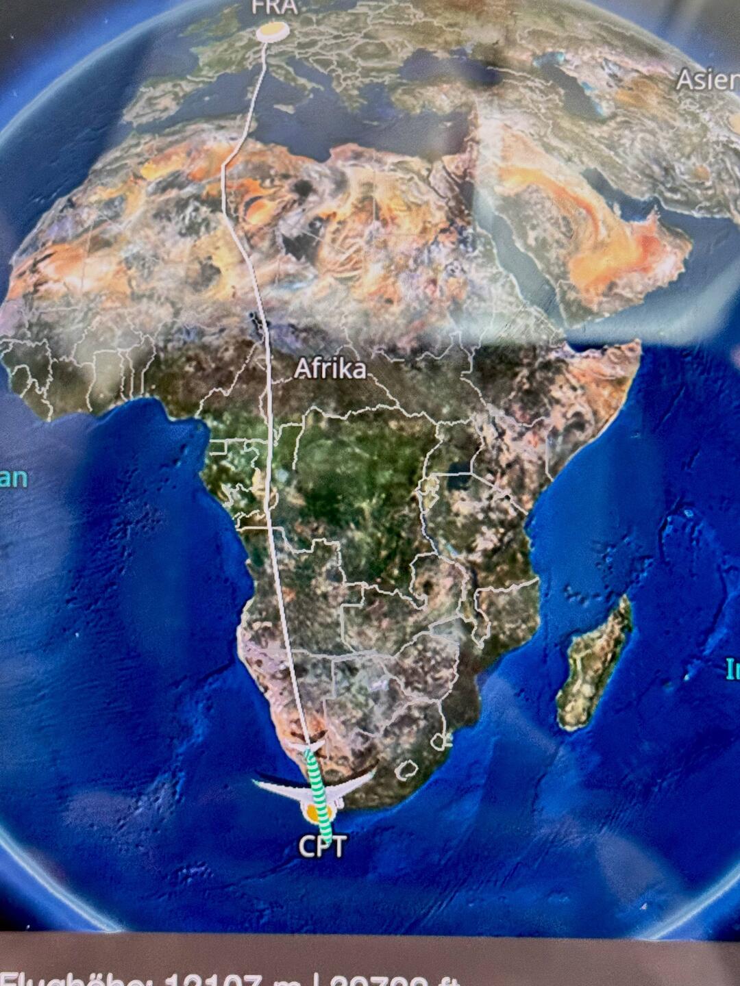 In knapp 12 Stunden Flug (mit einigen Turbulenzen) ging es über Südeuropa und einmal längs über Afrika.