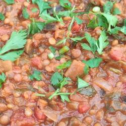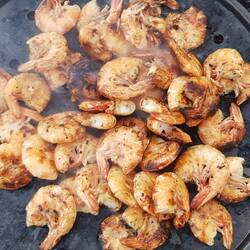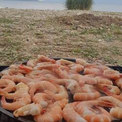 Auf der Speisekarte standen heute Reis, Auberginen-Linsen Soße und marinierte Shrimps vom Grill.