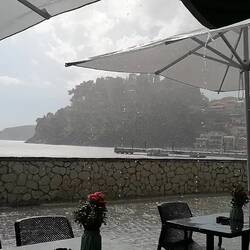 In der Taverna kochte die Hausherrin für uns, während ihr Mann am Nebentisch gespannt das Glücksrad schaute. Wir waren die einzigen Gäste und nach eineinhalb Stunden ließen wir die zwei wieder alleine mit ihrem TV Programm und flüchteten bei einsetzendem Regen in den Van.