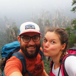 Im Nationalpark mussten wir gleich zu Beginn einen Shuttlebus zum Startpunkt unserer gewählten Wanderroute nehmen, doch der Bus fuhr dort einfach vorbei. 😕 An der nächsten Haltestelle zeigten wir einem Parkmitarbeiter wo wir hin wollten. Er wies uns mehrmals darauf hin, dass man von dieser Stelle nur zu Fuß hoch käme, es gab dort weder Gondel noch Mini-Bahn. Nachdem wir bestätigen, dass es uns klar ist und wir auch wirklich zu Fuß, selbst bis zur Spitze des Berges laufen wollten, hielt er einen entgegenkommenden Bus an, sagte dem Fahrer wo wir hin wollten und es ging los. Irgendwie kümmern sich die Chinesen doch dann immer doch um uns. 😀 Einige Minuten später wurden wir mitten auf der Straße raus gelassen. Der Wanderweg verlief unauffällig abseits der Straße, hier gab es weder irgendwelche Kioske oder touristische Einrichtungen, noch andere Touristen. Wir waren wiedermal ganz allein (wobei wir kurze Zeit später zwei Spanierinnen begegneten). Sofort führte der Weg bergauf - quasi von 0 auf 100. Es ging wieder tausende Stufen hoch, Treppen über Treppen über Treppen... Unsere Waden brannten und wir waren nass geschwitzt bereits nach wenigen Minuten. In ca. 2 Stunden bewältigten wir 700 Höhenmeter ausschließlich mit Treppen. Die Freude oben angekommen zu sein war uns wahrscheinlich gut an zu sehen. 😅 An einem schönen Aussichtspunkt machten wir eine Pause und genossen die Aussicht auf die Karstpfeiler, die mehr und mehr im aufsteigenden Nebel verschwanden. Hier lernten wir ein deutsches Pärchen aus Würzburg kennen, die vor einigen Monaten aus beruflichen Gründen nach Shanghai gezogen waren und verquatschten uns wieder. Es zieht doch sehr viele beruflich nach China 🤔.