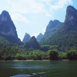 Auch wenn Guilin eine sehr entspannte Stadt ist, so wollten wir dennoch raus und in die wunderschöne Karstlandschaft außerhalb der Stadt eintauchen. Gesagt, getan! So ging es morgens mit dem Bus nach Yangdi, ein Dörfchen, das als Startpunkt für viele Bambusflosstouren dient. Auch wir haben uns eine romantische Flossfahrt gegönnt - so romantisch es in China eben sein kann bei den Menschenmassen. In unserer Vorstellung wollten wir mit einem traditionellen Bambusfloss, das durch das Abstoßen mit einem Stock bewegt wird, über den LiRiver dahin gleiten und die wunderbare Natur um uns genießen. Doch bereits beim Kauf der Tickets stellten wir fest, dass ein paar hundert andere ebenfalls die Karsthügel vom Wasser aus sehen wollten. 😬 Die Flosse hatten Platz für 4 Personen (wir teilten und das Bambusfloss mit zwei chinesischen Jungs), wurden per Motor angetrieben, der ziemlich laut war und es starteten mehrere Dutzend Flosse zeitgleich. Unsere Vorstellungen waren ziemlich naiv. 😂