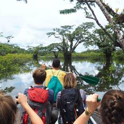 Zurück zur Lodge ging es mit einem Kanu. William - der wirklich krasse Augen haben muss - erhaschte ein Faultier im Baum, das sich sehr gemächlich von Ast zu Ast bewegte - seltsame aber auch beneidenswerte Tiere, die 20 h Schlaf am Tag benötigen😴. Wir hatten die Wahl auf direktem Wege zur Lodge zu paddeln oder noch einen kleinen Umweg über die Lagune zu machen, um noch ein weiteres Tier zu sehen. Zum Glück waren noch alle motiviert, denn auf der anderen Seite der Lagune bekamen wir das Highlight zu Gesicht. Eine ausgewachsene ANACONDA! Die ca. 6 m lange Riesenschlange wurde auf einem Baum erst vor 3 Wochen von einem Guide entdeckt. Die Schlange kommt aktuell nur zur Mittagszeit, wenn die Sonne scheint, aus ihrem Versteck um sich auf ihren Häutungsprozess vorzubereiten. Dank dem Kanu konnten wir das Tier aus nächster Nähe bewundern. Mit den Eindrücken ging es zurück zur Lodge, zur Siesta. Abends gab es eine erneute Wanderung durch den Dschungel, der bei Dunkelheit nochmal ganz anders wirkt. Der Klang des Regenwaldes ist faszinierend. Mit Taschenlampen suchten und fanden wir zahlreiche Insekten wie Skorpione, Riesenspinnen, Frösche und perfekt getarnte astähnliche Schrecken...Læs mere