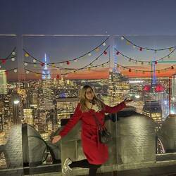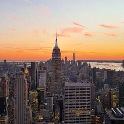 Sonnenuntergang auf dem Rockefeller Center mit Blick aufs Empire State Building.