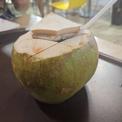 Dann nahmen wir die BTS von Chit Lom zum Terminal 21. Hier soll in der 5. Etage ein Foodcourt sein dr das günstige Essen überhaupt hat. Wir hatten wieder Platz und es gab Abendessen dort. 40 Baht also 1€ für mein Essen. Eine Kokosnuss von Matze für 1€ und Mango StickyRice für 1€ echt nicht schlecht. Man lädt vorher Geld auf eine Karte und dann zahlt man damit einfach.