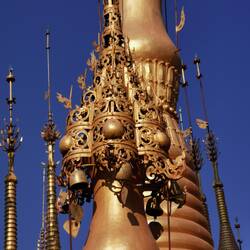 Unterwegs gabs auch noch 2 Pagoden. Die Phaung Daw zwischen 1200 und 2000 Jahre alt aus der Zeit von König Ashok. Sie zählt zu den heiligsten Stätten des südlichen Shan Staates. Umgeben von hunderten kleineren oder grösseren Pagoden. Viele wieder mit den vergoldeten Glöckchen. Dieser Klang wenn der Wind sanft die Klöckchen bewegt. Augen schliessen und hören und träumen.