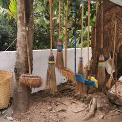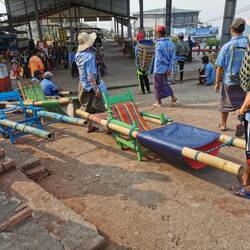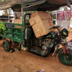 Unterwegs fallen uns viele vollbepackte Gefährte auf. Ein Mofa mit Stühlen in 4 Etagen gestapelt oder ein Moped bei dem der Fahrer einen rundum Airbag aus Chips hat. Ein Kleinlaster bis zum Anschlag voller Güter und obendrauf noch Leute. Der Aussenbordtruck, der unter der Bambus Ladung gar nicht mehr auszumachen ist. Ton Töpfe, so sorgfältig gestapelt, dass nicht einer kaputt geht, dass aber auch kaum noch eine Nadel Platz hätte.
