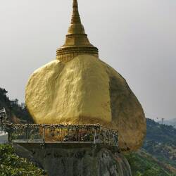 Zwischen Marktständen gehts dann Treppauf zum Golden Rock. Eines der wichtigsten Heiligtümer im Buddhismus. Die Legende sagt, dass EIN HAAR von Buddha, in der Pagode eingebettet, den Felsen im Gleichgewicht hält. Gefällt mir persönlich auch besser wie jede statische Erklärung. Die Fahrt runter vom Berg war tatsächlich noch rasanter.