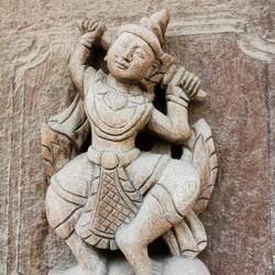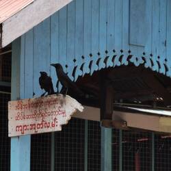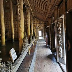 Oder das wunderschöne, aus Teakholz bestehende Kloster. Einzigartig all die Holzschnitzereien, die Türen, die Anordnung der Fenster, damit das Innere lichtdurchflutet wirkt. Ich konnte mich kaum sattsehen, habe immer wieder andere Figuren, Ornamente, Verzierungen entdeckt. Ich hätte Stunden an diesem kühlen Ort verbringen können. Vom Westeingang her ist der Blick frei auf einen filigranen Buddha, jede Menge silberner, mit edlen Steinen und Spiegeln verzierten Schatullen. Einst Wohnsitz des 2 letzten Königs von Burma. Nach dessen Tod übergab der Sohn das Gebäude den Mönchen.