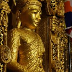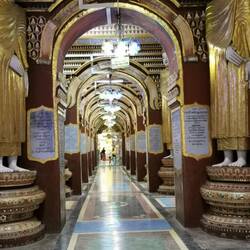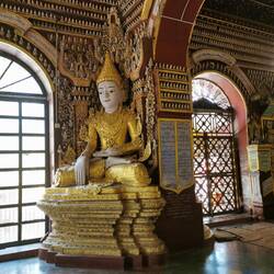 Zu den 3 Hauptpilgerzielen zählt die sitzende Mahamuni Statue (erhabener Weiser). Die andern sind Shwedagon Pagode und Golden Rock. Eigentlich war es einmal eine einfache Bronzstatue von 3,8 m Höhe. Inzwischen ist sie fast bis zur Unkenntlichkeit mit Blattgold überzogen. Das Gewicht des aufgeklebten Goldes wird auf mehrere Tonnen geschätzt. Die Goldschicht an den Armen soll 35 cm betragen. Und jeden Tag opfern die Leute in ihrem unerschütterlichen Glauben.