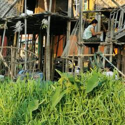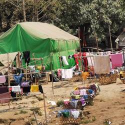 Am Iriawady...... Haben wir noch etwas Zeit die Gegend zu erkunden. Planen als Dach und Schutz vor Sonne und Regen. Gestank, Müll und Lärm. Und die Frauen versuchen den staubigen Boden vom Unrat sauberzukehren. Wäsche flattert im Wind, Kinder winken mir zu, Frauen stillen ihre Babys, Männer stehen unter der Freiluftdusche.