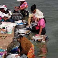 Bei einer Frau die am Strassenrand ihre Wäsche klopfte.