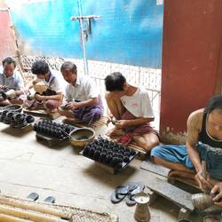 Kupfergiesserei. Unter freiem Himmel werden Negative von grossen Buddhastatuen angefertigt. Kupfer geschmolzen und dann gegossen. Kinder tragen die ausgekühlten Steine dann wieder weg.
