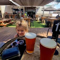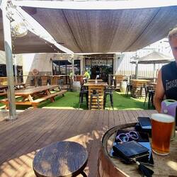 Today we rolled past the many ore trains into Karratha. It's hotter here on the coast, so we dropped into the local brewery for a cool, refreshing ale and a bowl of chips.