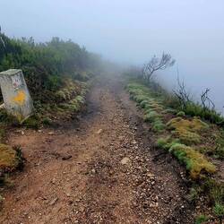 Enfin après 8 km (et pas loin de 2h30), j'arrive au sommet de Puerto del Palo à 1150 m d'altitude. Là haut, il y a un brouillard à couper au couteau, et du vent ! Ça caille !!