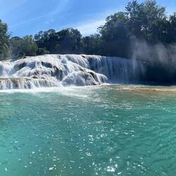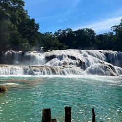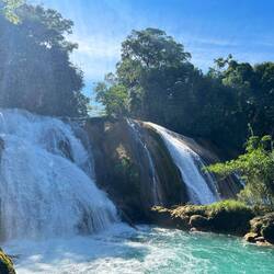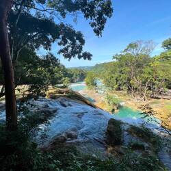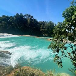 Strahlend türkisblaues Wasser zeigen die Wasserfälle von Agua Azul. Dort stürzt sich der Rio Tulijá in die Täler des Chiapas. Fahrzeit etwa 1,5 Stunden.