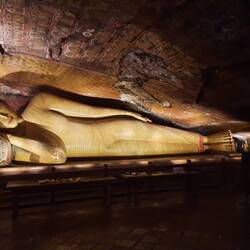 Die liegende Figur (12 m) liegt auf schönen Kissen mit Lotusmuster und zeigt den sterbenden Buddha vor seinem Eintritt ins Parinirvana.