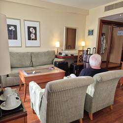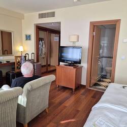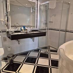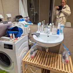Jetzt haben wir unsere Kabine bezogen, wie ein kleines Gefängnis, mit eigenem Badezimmer. Hier sollen wir es 24 Std aushalten. Ja wir können natürlich auch mal etwas rum gehen, aufs Deck glaube ichLäs mer