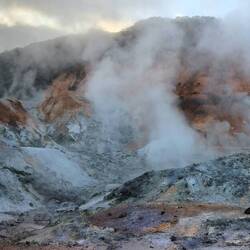 עננים של קיטור ושל מימן גופרי מרחפים מעל עמק זרוע בכתמים. צהובLue lisää