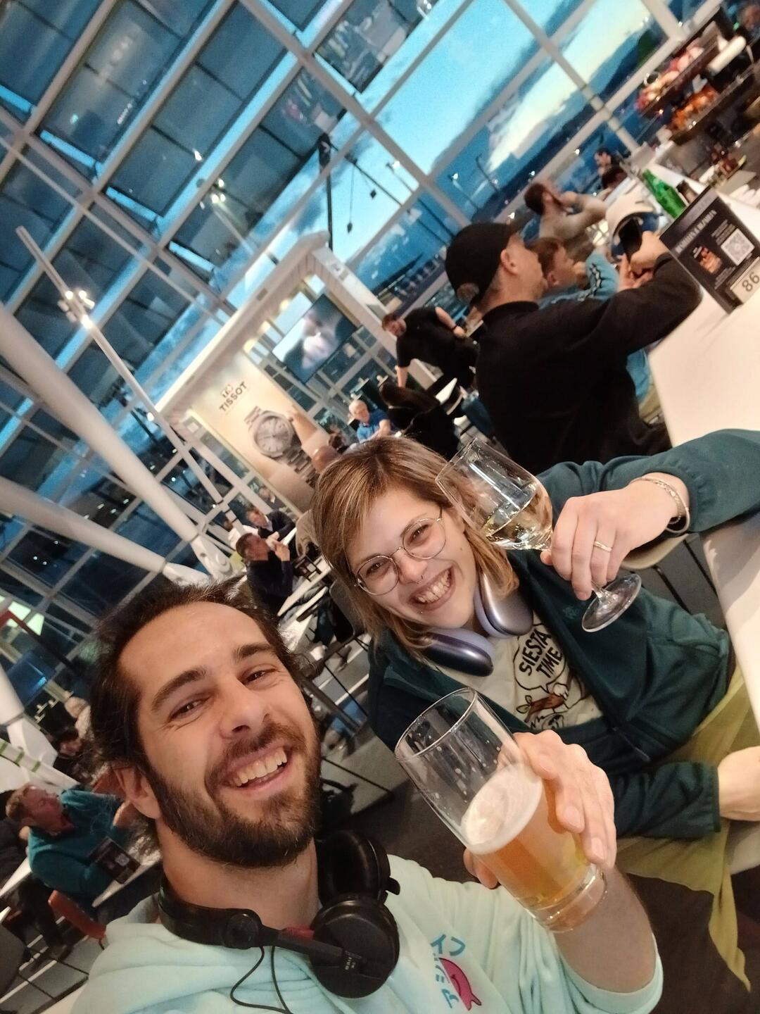 Einisch meh höckle mir bim ne völlig übertürte getränk am flughafe und warte uf üse flug. Amsterdam mir chöme! 🥳😅