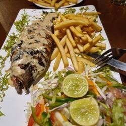 Erst haben wir uns den Fisch zeigen lassen und dann wurde er zubereitet, ein Black Snapper.