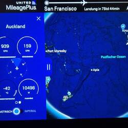 Nachdem dann endlich der Check-in für den Weiterflug von San Francisco nach Auckland losging, saßen wir im Flugzeug und haben gewartet, bis es losging. Die Plätze waren diesmal tatsächlich besser, weiter hinten in einem Abschnitt direkt vor den Toiletten. Dadurch konnten wir die Sitze nach hinten stellen und halbwegs vernünftig schlafen. Zuerst haben wir noch versucht, ein bisschen wach zu bleiben, bis der Service durch war, ungefähr eine Stunde. Danach sind uns beiden relativ schnell die Augen zugefallen und wir haben begonnen zu schlafen.