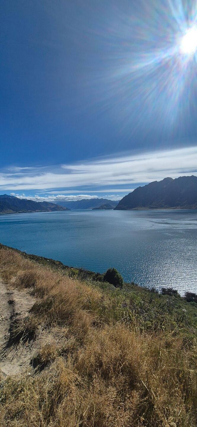 Kurz nach Queenstown haben wir wieder angehalten, oben auf dem Berg, an genau der Stelle, wo wir schon einmal gestoppt hatten. Heute aber bei richtig schönem Wetter und angenehm warmen Temperaturen. Also Sachen geschnappt und losgewandert. Zwei Stunden, ein schöner, angenehmer Anstieg mit richtig guter Aussicht. Oben dann die Reste vom gestrigen Abend gegessen und einfach ein bisschen die Stimmung genossen. Die war heute echt gut, muss ich sagen.
