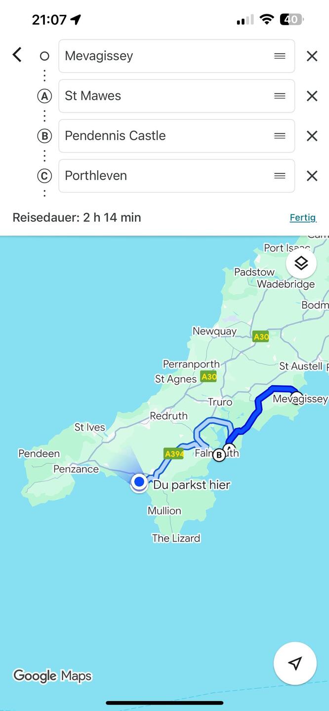 Mit Dickwolkensonnenlochhimmel Abfahrt vom schönen Fischereihafen Mevagissey um 10:15 Uhr über Schluchtenwege, die nichts für Angstdriver sind, gelangen wir um 11:00 Uhr ans St. Maves Castle mitもっと詳しく