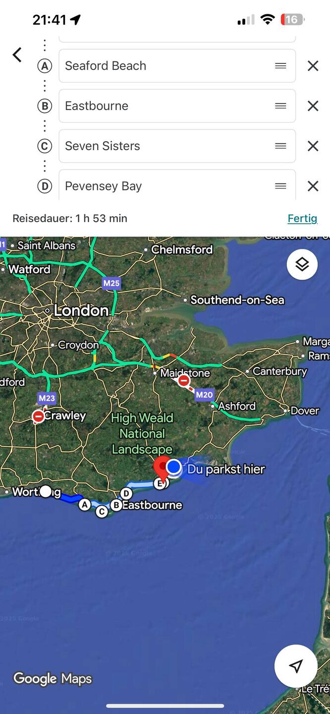Am Langen Strandparkplatz von Worthing fahren wir pünktlich um 9:00 Uhr ab Richtung Eastbourne Felsen in Telscomb, machen da einen langen Spaziergang über dicken Kieselstrand mit mit viel Flint- undBaca lagi