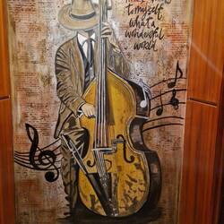 On the main staircase a man was sitting cross legged ,playing an Indian musical instrument.