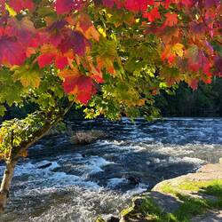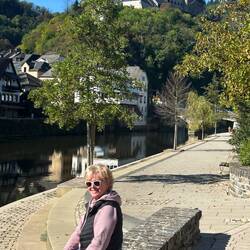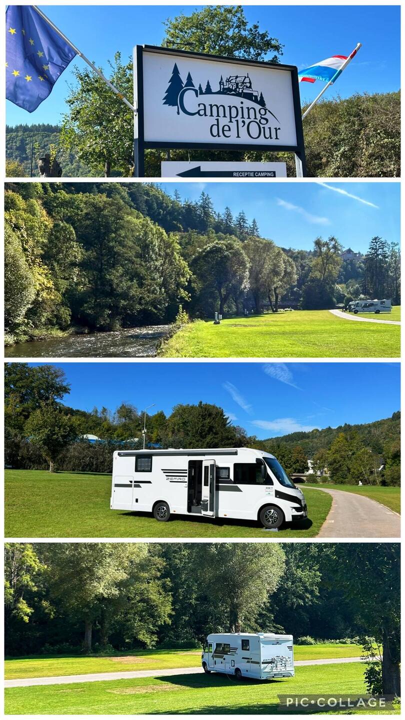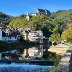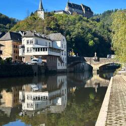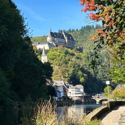 Netten und ruhigen Stellplatz in Vianden gefunden. Spaziergang an der Our entlang mit herbstlichem Ahorn ins Zentrum von Vianden mit Blick auf den Hockelsturm und das Château Vianden.