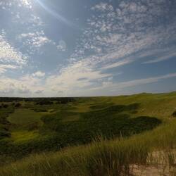 Wir fahren weiter ins Innere und kriegen einen ausgiebigeren Eindruck von der Insel. Die Landschaft ist ein gleichmäßiger Wechsel aus Dünen, Feldern, und Landhäusern mit Holzschindeln.